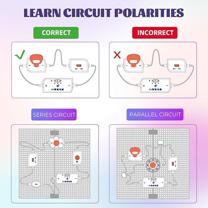 - 【Easy Operation】Engineered for simplicity, these STEM toys for boys and girls require no tools or soldering. All numbered and color-coded components snap securely onto the plastic grid base, offering a safe and genuine circuit-building experience that keeps kids focused and confident throughout the process.