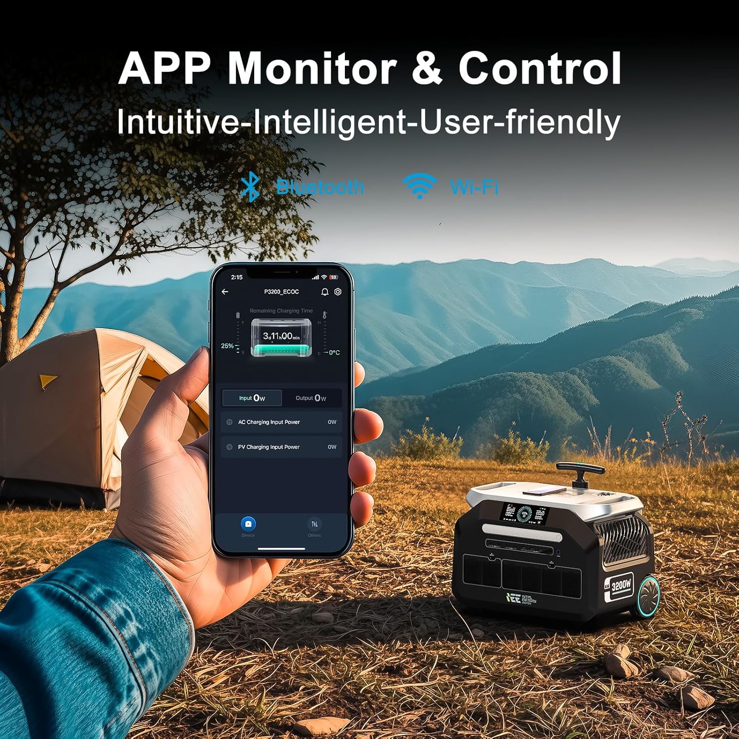 - You can use the mobile phone APP to connect to the power station via Bluetooth or WiFi to control the input and output of the power station at any time, monitor the remaining power of the device, etc.