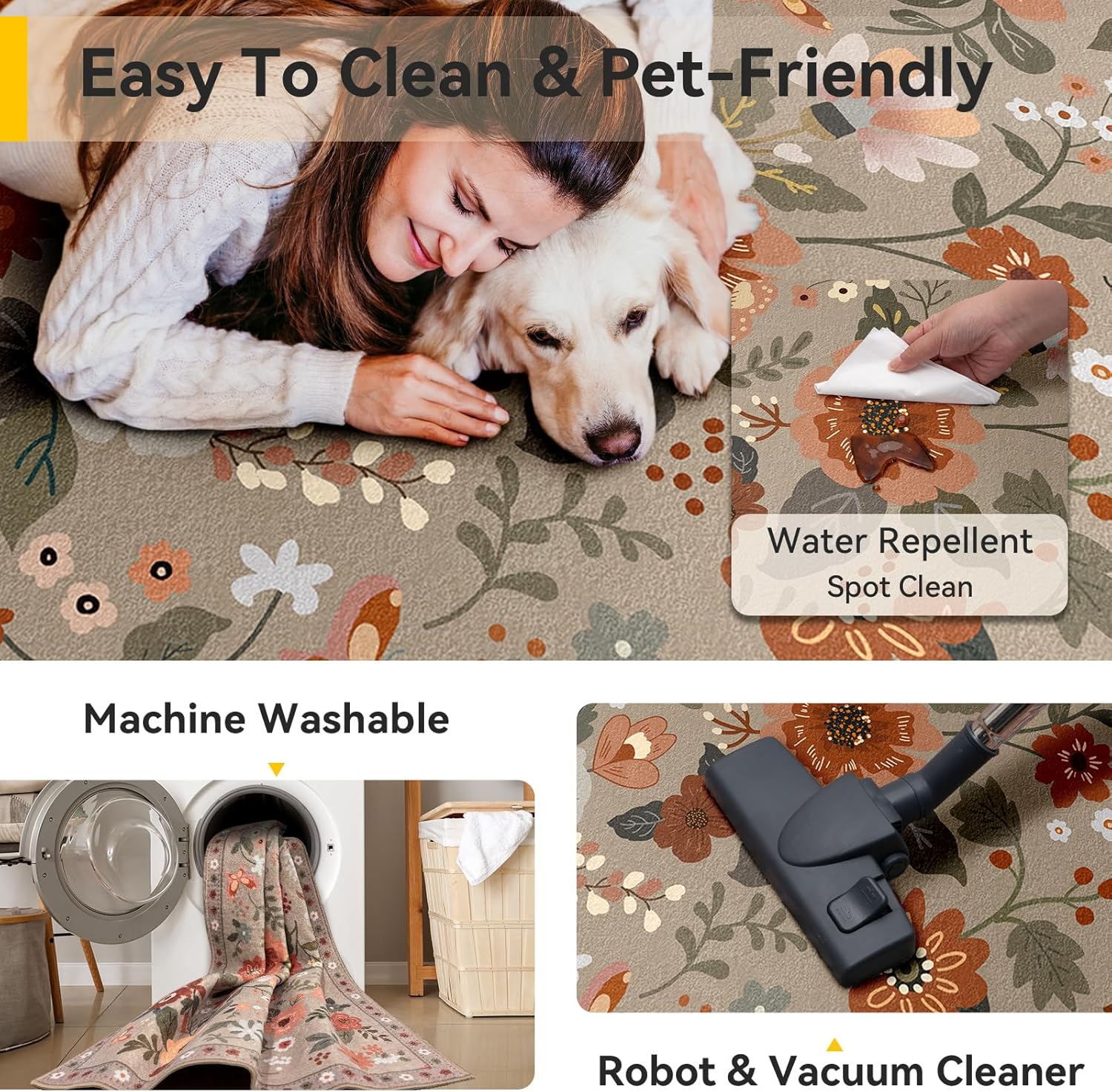 Floral 5x7 Area Rug Machine Washable Soft Print Boho Carpet Non Slip Doormat Low Pile Flower Area Rugs for Living Room Bedroom Nursery Kitchen Dining Room Indoor-Brown/Brick