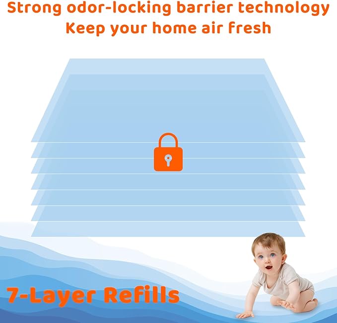 - DURABLE 7-LAYER FILM: Engineered with a 7-layer construction featuring an EVOH barrier, our diaper pail refill bags are designed to lock in odors completely. This technology ensures fresher indoor air and provides a healthier environment for your baby