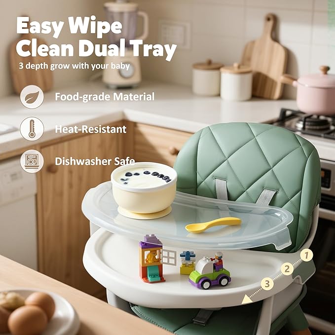 - Removable & Adjustable Tray: Baby high chair equipped with removable tray for eating and feeding and footrest for storing toys; The tray can be adjusted to 3 positions, providing more space for fast growing children
