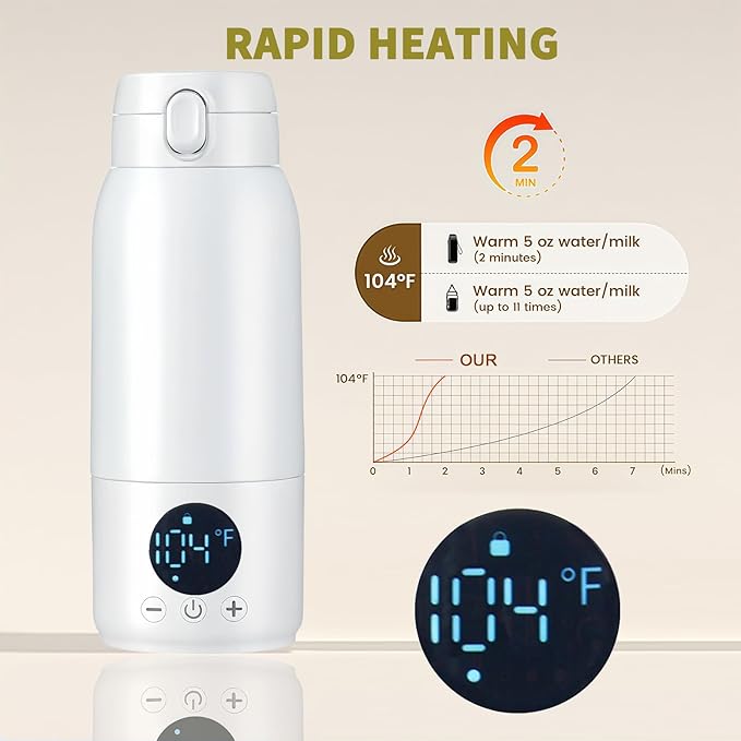 - Fast&Precise Heating with Customizable Temp Control:Heat breast milk, formula,or water to the perfect temperature (up to 155°F) in minutes. Adjustable settings let you choose the ideal warmth for your baby's needs while preserving nutrients. Faster than most portable bottle warmers—ideal for travel, car rides, or late-night feedings,It is recommended to heat the milk according to the baby's milk volume. Testing shows that heating 5oz of milk takes only 2 minutes