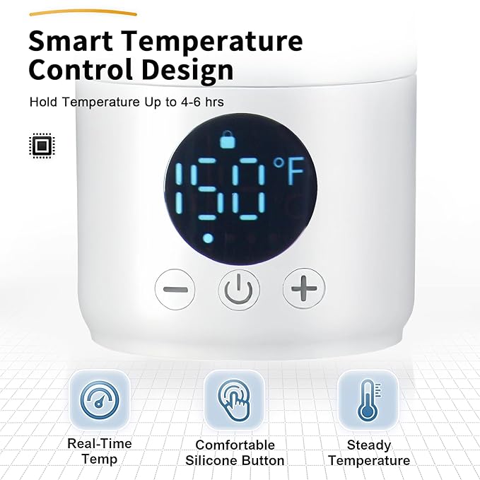 - Smart Features for Hassle-Free Use:LED temperature display shows real-time warmth levels. Auto keep-warm mode maintains heat for hours, while the wide mouth allows easy cleaning. Works with most baby bottles, ensuring compatibility wherever you go
