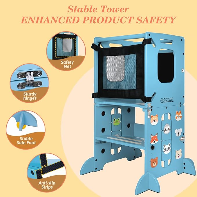 - 【Stable and Safe】The folding toddler tower features 8 removable non-slip support feet to minimize tipping risks. Carefully rounded edges and smooth surfaces prevent injuries, while a safety net eliminates fall hazards. The kitchen stool for toddlers Includes non-slip strips for enhanced stability on both the base and stepping surface.