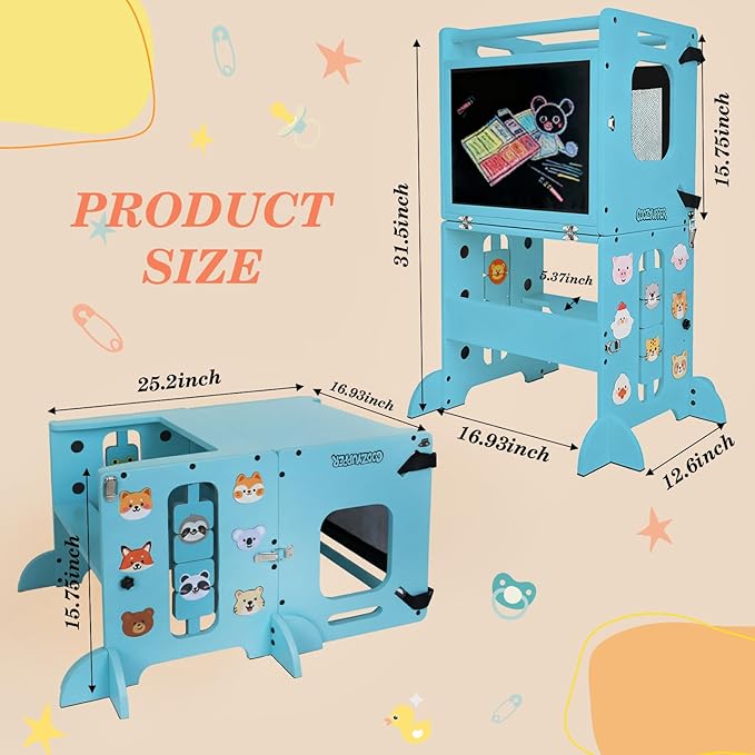 - 【Multi-Functional Kids Furniture】Easily transforms from a toddler standing tower to a toddler table and chair set with simple locking mechanisms! Designed to grow with your child, it includes functional elements like a chalkboard. Supports up to 150 lbs, ensuring safety for daily use in kitchen or bathroom.