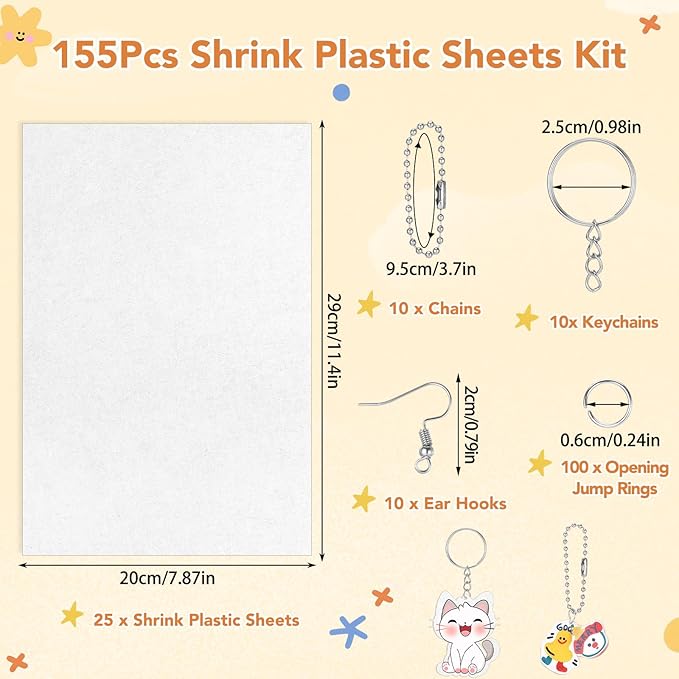 - 【Package Included】Shrinky plastic kits for kids: 25 x Shrinky Plastic Sheets, 100 x Opening Jump Rings, 10 x Ear Hooks, 10 x Keychains, 10 x Chains, 1 x Instruction.
