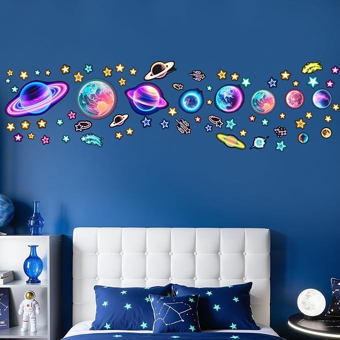 - 【PACKAGE INCLUDED】You will get a set of glowing neon celestial wall sticker set with colorful planets, stars and tiny spots. Decorate the ceiling with charming glow in the dark stars and give your child's room a new look.