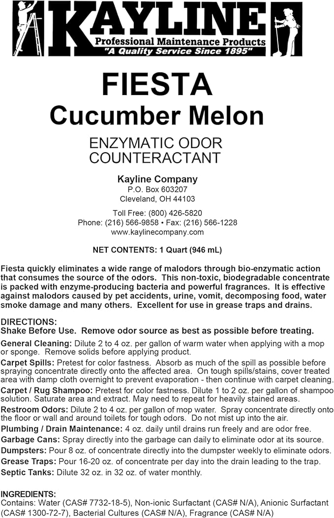 Kayline Fiesta Multi-Purpose Bio-Enzymatic Odor Eliminator for Trash Can, Carpet, Diaper Pail, and Pet Urine, 32 oz Pour or Spray Botttle, Cucumber Melon Scent