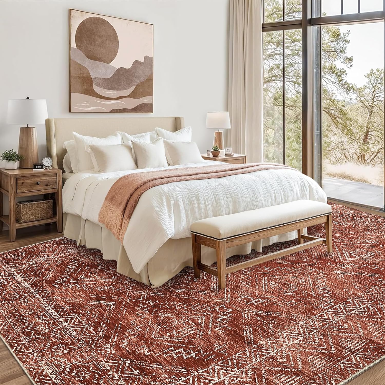 COZYLOOM 8x10 Rug Modern Indoor Area Rug Machine-Washable for Living Room or Bedroom Softness Foldable Mat for Easy Storage Geometric Design Non Slip Rug Low Pile Stain Resistant Carpet, Brick Red