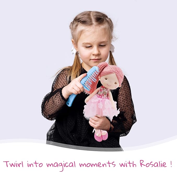 - MEET ROSALIE: A graceful ballerina plush doll with pink yarn hair, a floral-print top, and a 3D flower tulle skirt—ready to twirl into your child's playtime.