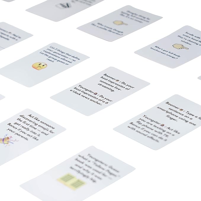 - WHAT’S INSIDE - 50 hilarious prompt cards across 5 categories: Roast, Who Had It Worse, Quickfire Dares, Generation Decoder, and Boomer vs. Youngster Face-Offs. Compact, travel-friendly, and no setup required, just shuffle and start the chaos.