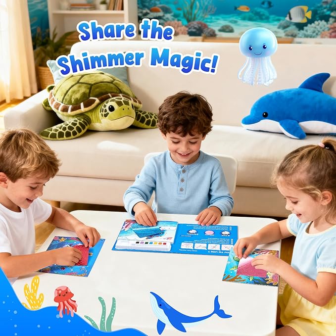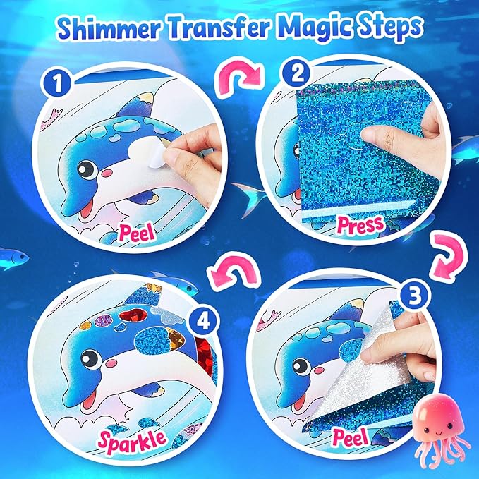 - Sparkling Craft Art, Easy to Create Stunning Sea Animals Effects: Craft is simple yet incredibly fun! Simply peel away parts of the design to reveal the sticky surface, apply the sparking pieces, then gently peel it off to reveal a dazzling Sea Animals artwork. Not only will kids experience the joy of success, but they will also improve their focus and fine motor skill from this craft activity. The vibrant princess-themed artwork will leave kids proudly showcasing their creations