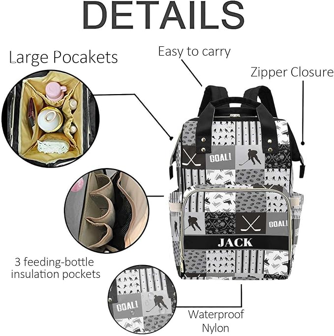 Custom Hockey Baby Diaper Bag with Name – Personalized Nursing Travel Tote Backpack for Mom or Dad, Custom Name Baby Daypack Gift