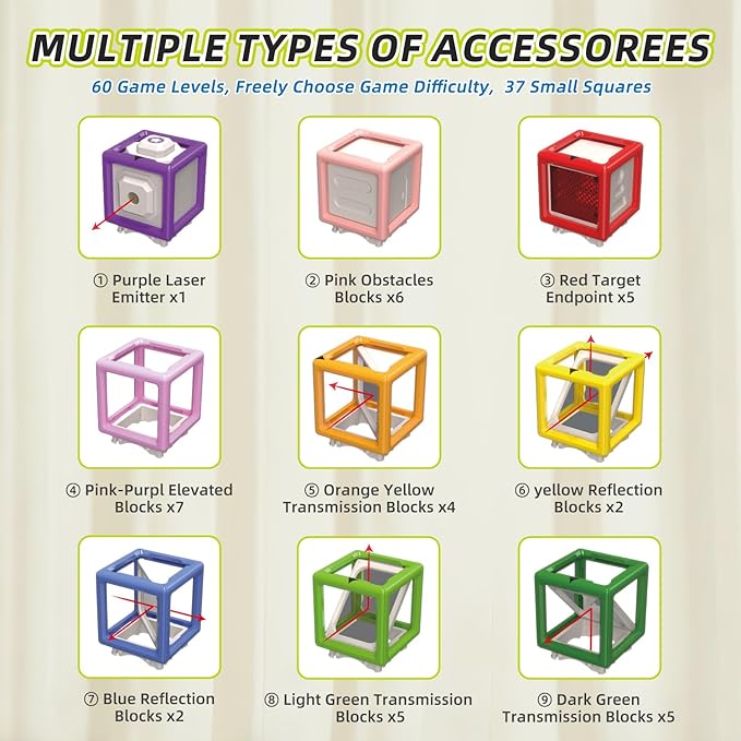- No Threshold Game: The STEM game set does not require installation and can be played immediately upon opening. By following the instructions in the manual, you can understand the function of each block and gradually adjust the angle of the mirror to easily pass the game. Both adults and kids can participate in the game