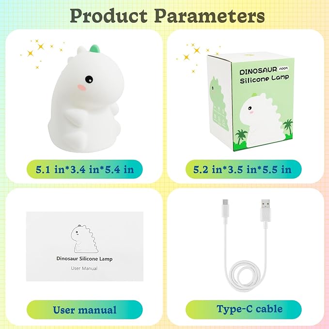 - 🦖[Soft Dinosaur Night Light for Kids] -- Crafted from non-toxic, odor-free, and bite-resistant silicone, this squishy dinosaur night light is ultra-soft, lightweight, and safe for kids of all ages. Ideal gift and dinosaur room decor for kids