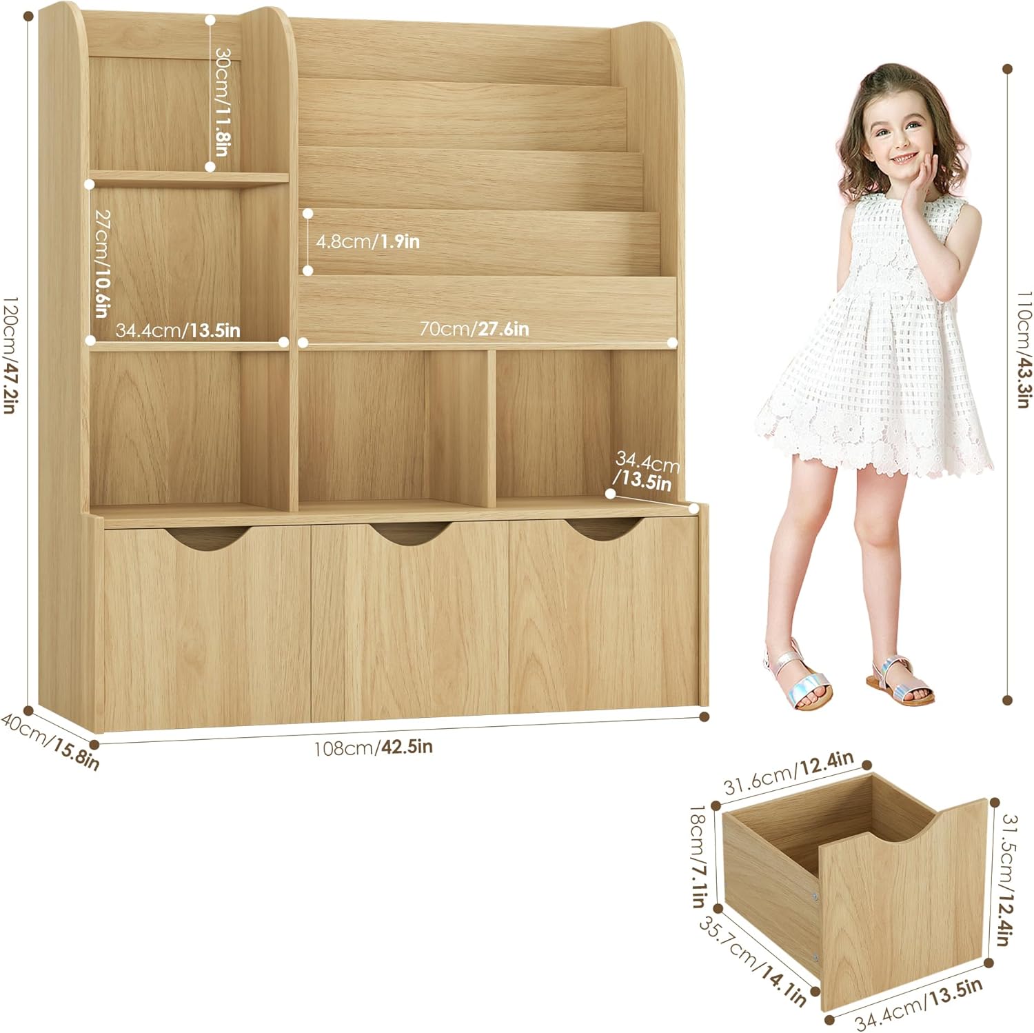 FOTOSOK 47'' Kids Bookshelf with Toy Storage, Multifunctional Bookcase with 5 Storage Cubbies and 3 Movable Drawers, Toy Storager Display Stand, Toy Organizer and Storage for Playroom,Bedroom, Natural