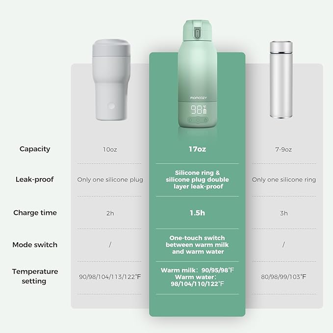 - Fast Heating: Momcozy portable milk warmer can heats water to 104°F in just 3 minutes and refrigerated breast milk to 98°F in 5 minutes, ready before your little one starts crying from hunger.