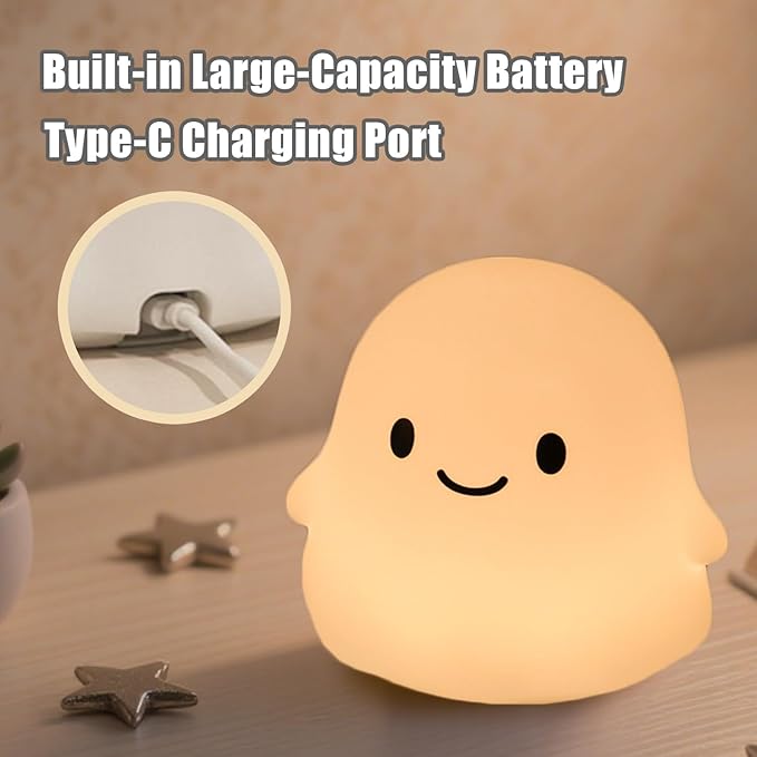 - Tap-to-Control 2 Brightness Levels: This ghost night light features soft silicone material—just tap the cute ghost shape to switch between two brightness modes. Low brightness offers gentle glow for bedtime (won’t disturb sleep), while high brightness provides enough light for midnight trips or diaper changes, fitting all your nighttime needs.