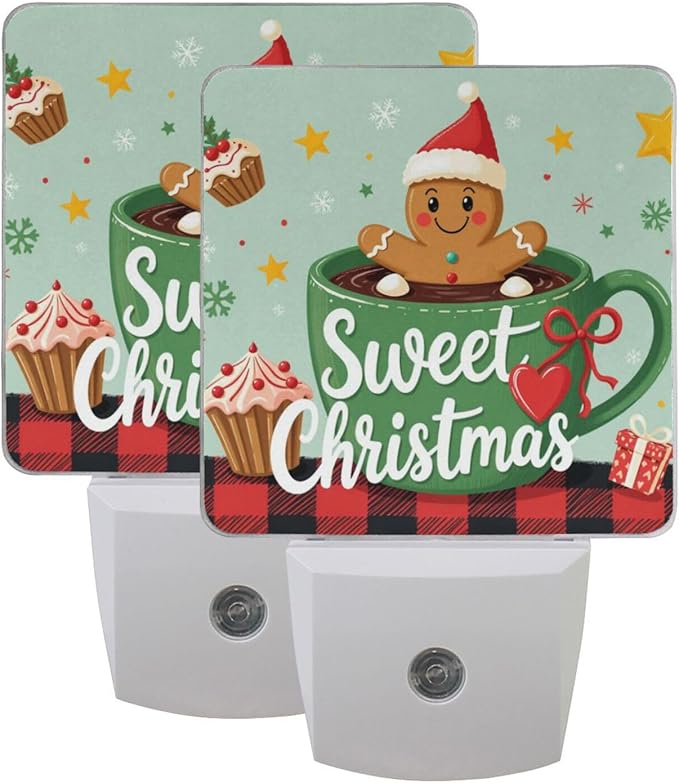 Aslsiy Night Light for Kids Gingerbread Man Cup Christmas Plaid Plug in Wall Lamp LED Dusk to Dawn Sensor Energy Saving Nightlight for Boys Girls Men Women