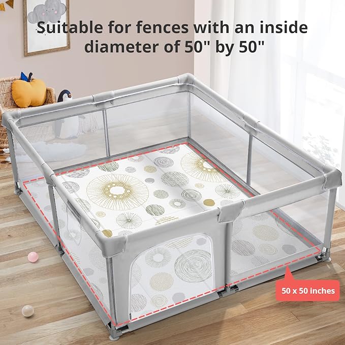 - Safe XPE Material: It fits into a playpen with an inside diameter of 50 x 50 inches. The baby play mat for the floor is made of high-density XPE foam material, which is soft and protects your baby's sensitive skin from the hard floor. Baby play mat has great traction from the raised alphabets all over the mat to avoid baby falling.