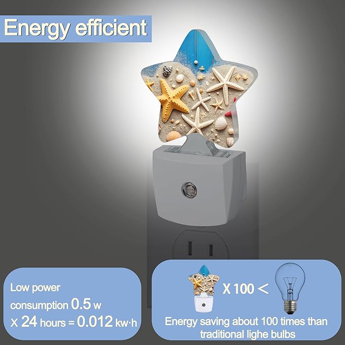 Coastal Seashell Starfish Night Lights Plug Into Wall,Blue Wooden Star Night Light for Kids,Nightlight with Dusk to Dawn Smart Sensor for Bedroom Bathroom Decor,Children Women Men Gift