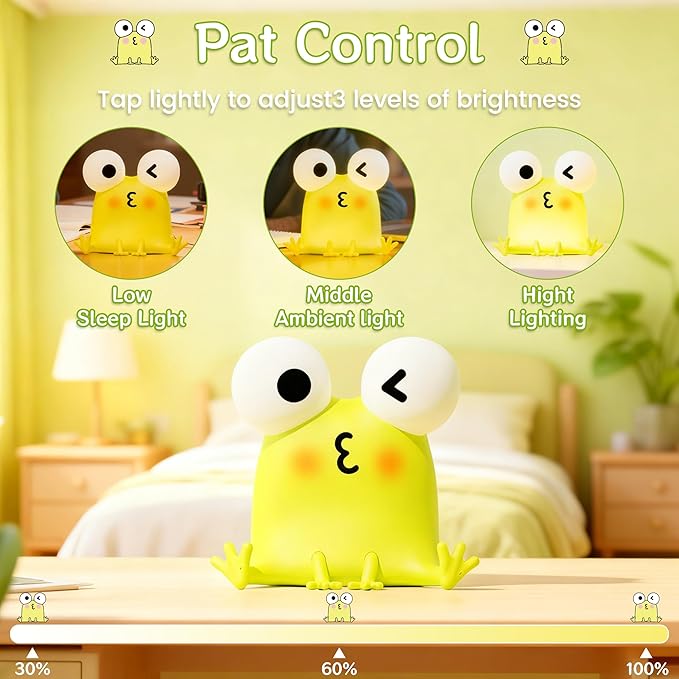 - 3-Level Brightness Adjustment : The frog nursery night light offers 3 levels of brightness (low, medium, high) to meet different needs. this baby lamp comforts kids at bedtime, easing fear of the dark while serving as a playful companion. Nursing moms use it for midnight feedings or diaper changes. adults enjoy its calming ambiance for remote work. Elderly users loves its portable feature, ensuring safe nighttime navigation to prevent falls. A versatile, heartwarming light for all ages