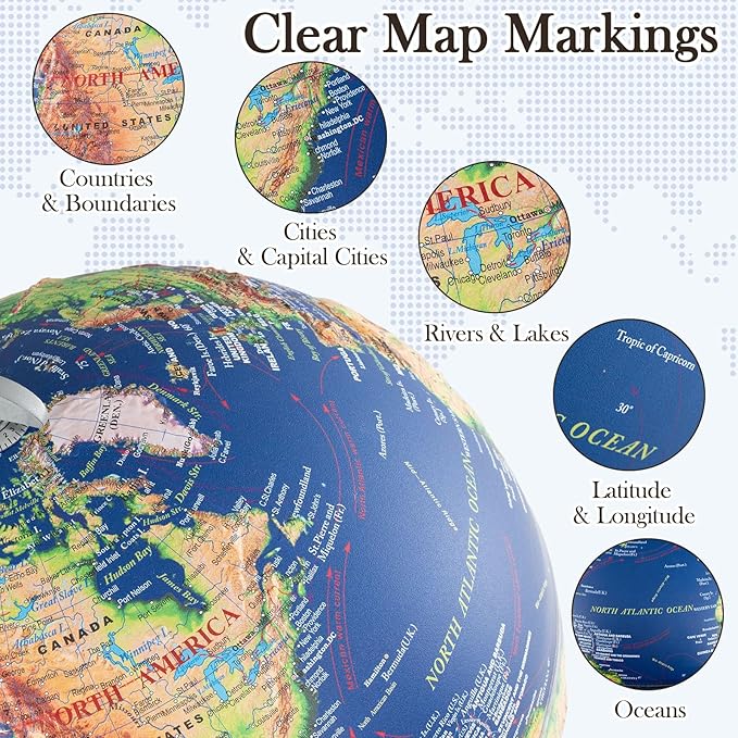 - Clear Map Markings: This world globe displays latitude and longitude lines, countries, boundaries, capitals and main cities, as well as oceans, rivers, and lakes. Precise and easy-to read, it serves as an ideal tool for both in-depth study and casual exploration.