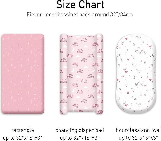 - 3-Pack Bassinet Fitted Sheets: Our Organic Bassinet Mattress Sheets (32"x16") offer universal fit for all bassinet mattress types—compatible with hourglass, oval, square, and rectangle designs.