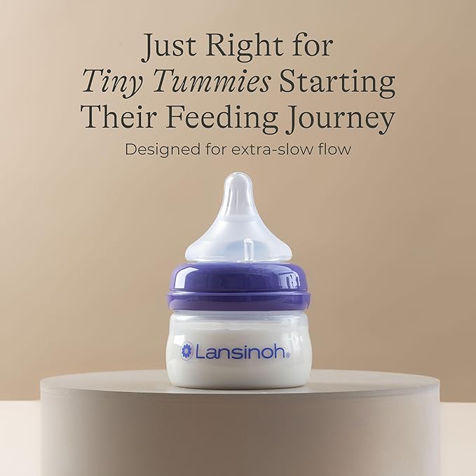 Lansinoh Anti-Colic Baby Bottles for Breastfeeding Babies, 2 Ounces, 2 Count, with 2 Extra Slow Newborn Flow Nipples, Size XS