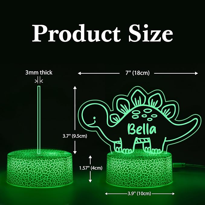 - Sof and Warm Glow: This cool dinosaur LED night light is crafted from acrylic material. You can customize the dinosaur night light by engraving a name to create a unique, personalized baby gift. The light comes with a white base and allows you to switch between 16 lighting colors via remote control. It serves as a perfect decorative piece for a child's bedroom. The LED lamp can be powered by the included USB cable (power adapter not included) or 3 AA batteries (batteries not included).