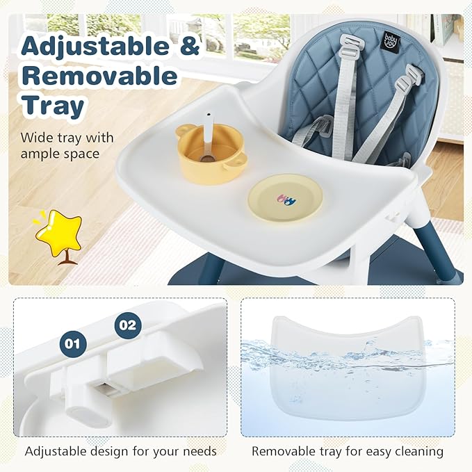 - Adjustable & Removable Tray: The tray has two levels adjustment and you can easily adjust it when your baby needs more free space. Not only does it have ample space for holding food or toys, but also its raised edge can prevent the items from falling down. Moreover, it is easy to clan due to its washable and removable design.